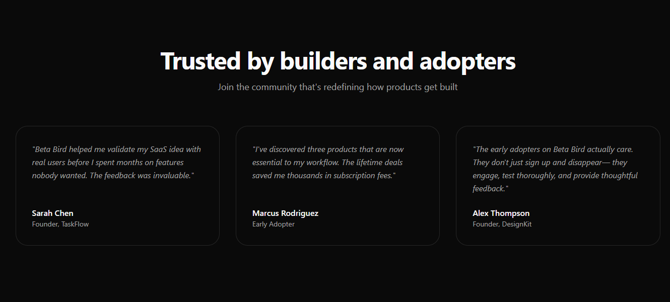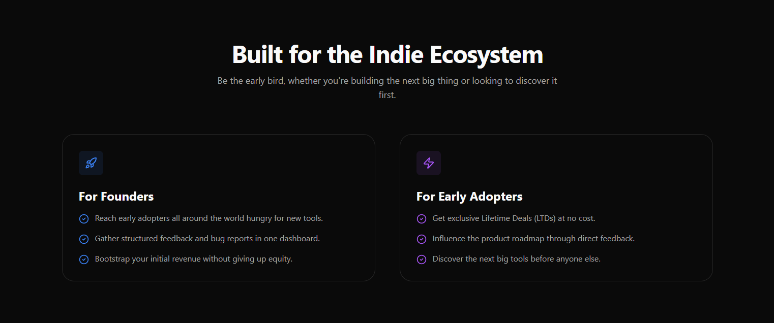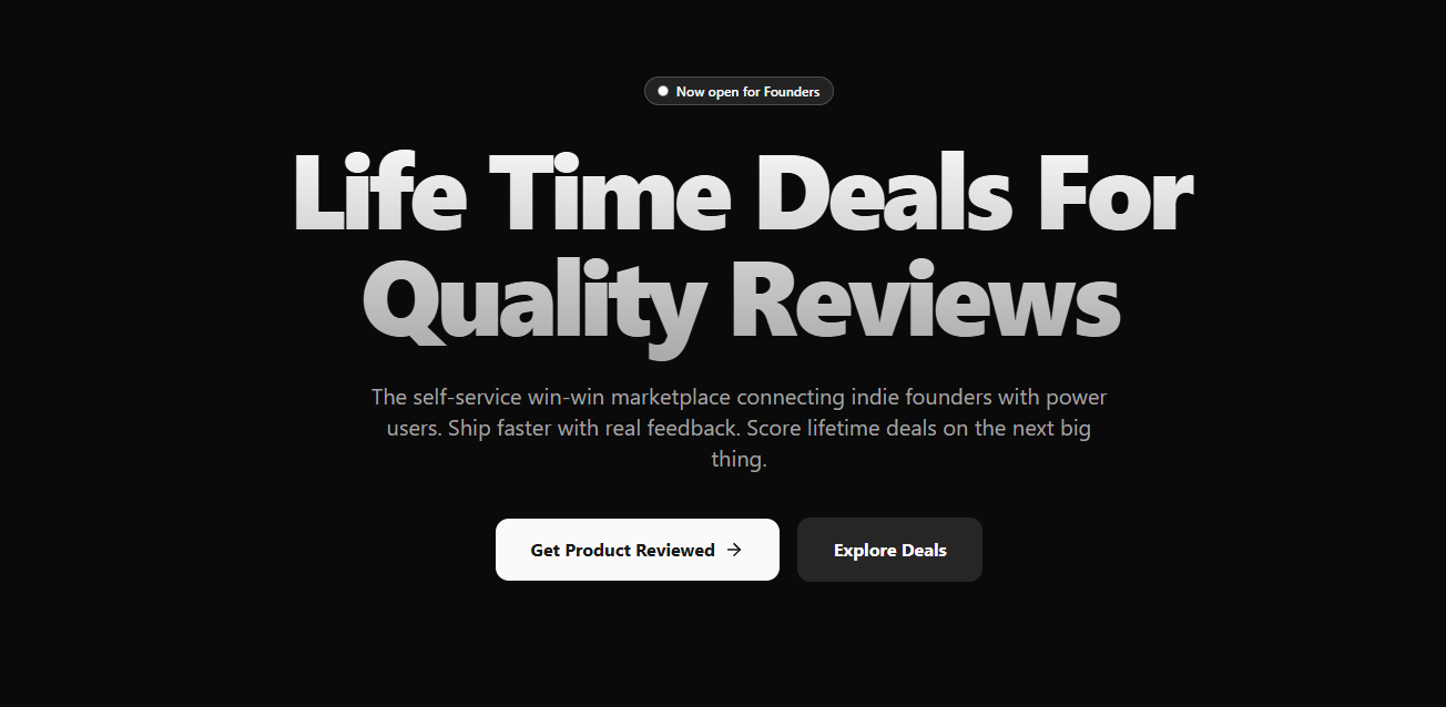 How do you typically find your first users who'll give you actual useful feedback (not just "looks cool!" comments)? I've been thinking about this problem a lot because: - Paid ads are expensive for early-stage validation - ProductHunt is hit-or-miss - Friends are too nice to be honest - Randoms on the internet don't have skin in the game Wild idea I'm testing: What if founders could offer lifetime deals to serious early adopters in exchange for detailed, structured reviews? Not just beta testing β more like a partnership where: - Founders get engaged users who care about the product succeeding - Early adopters get exclusive pricing + the satisfaction of shaping something new - Both sides win Built a small platform to test this, and looking for a few productivity-focused founders to try it out! No cost, just want to see if the concept has legs.