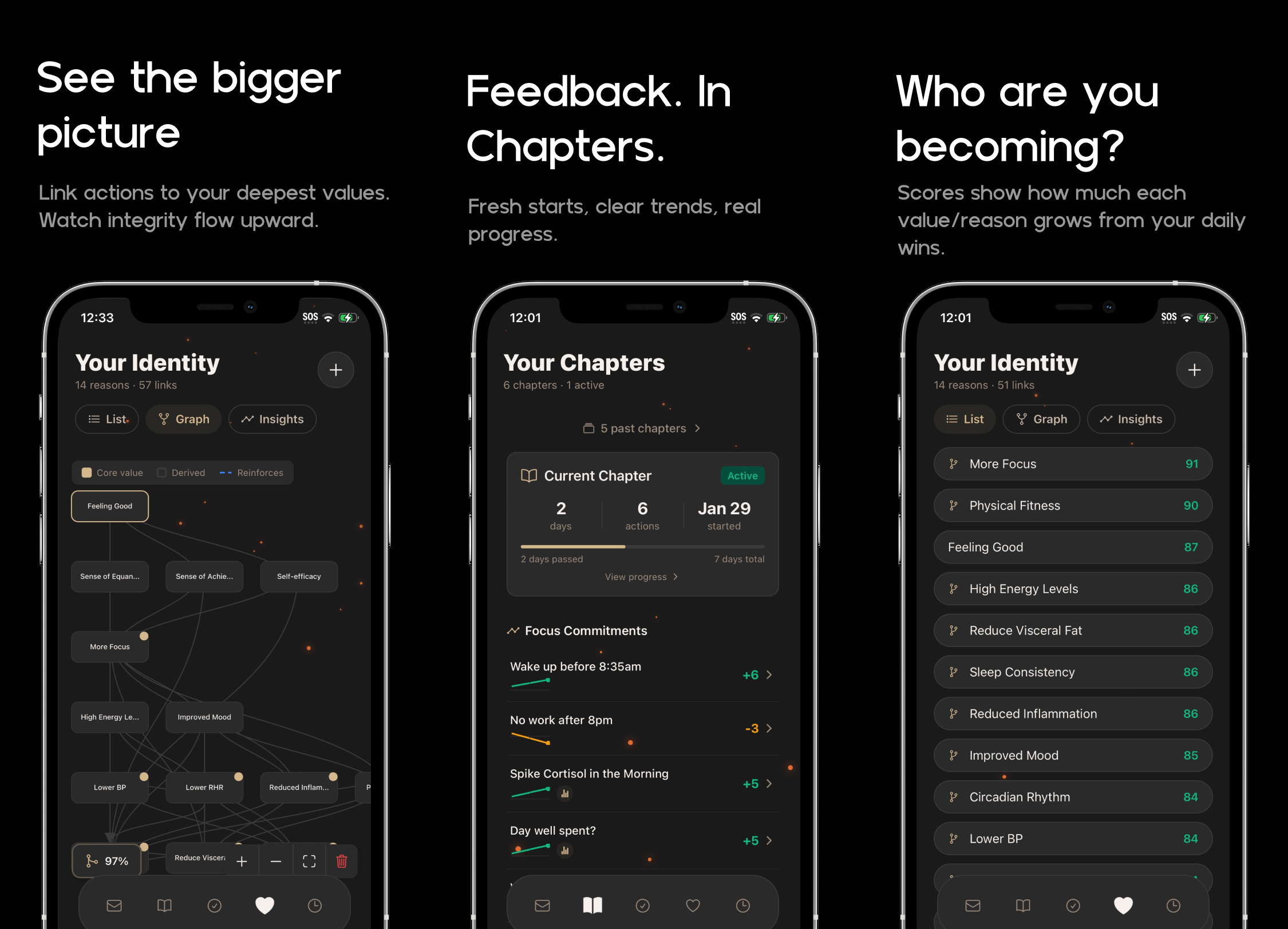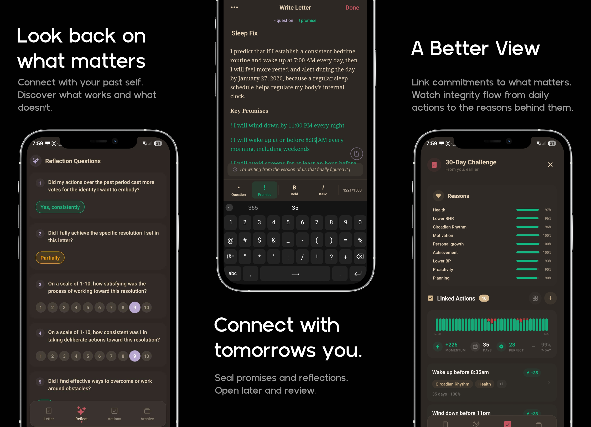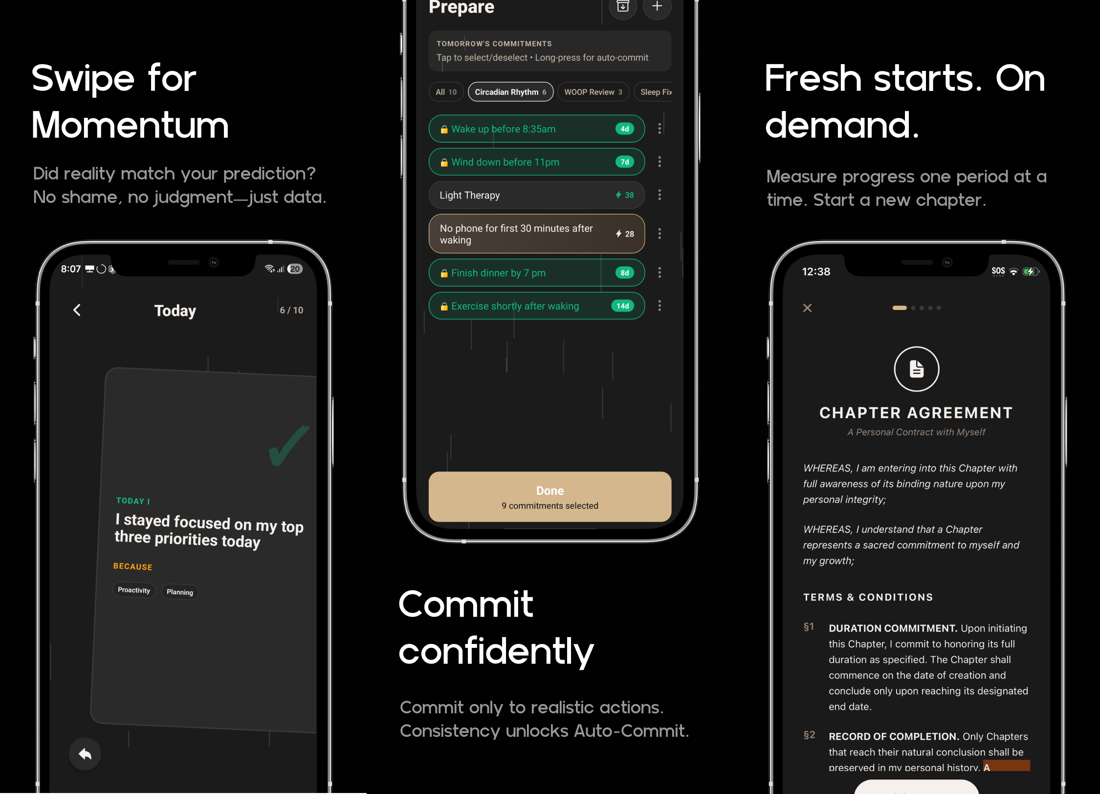 Most habit apps ask: “Did you do the thing?” Resolved asks: “Did you do what you said you would?” That small gap—between what you promise yourself and what you actually do—is the data that truly predicts lasting change. How it works Daily Promises Each evening, choose a few realistic actions tied to your reasons and make a deliberate promise to do them the next day. You only commit to what you honestly expect to follow through on. (What you don’t commit to is just as useful—it’s honest insight into where you’re not ready yet.) At night, swipe to mark what you completed. Consistent wins build momentum that grows exponentially. High momentum unlocks Auto-Commit: the right to commit multiple days in advance because you’ve earned that credit with yourself. Reasons Build a clear hierarchy of whys. Link daily actions to values, then link those values to deeper reasons. Over time, you create a personal map that traces everything back to your core—what really matters to you and which parts of your life need more attention. Chapters Break life into focused periods with a clear start and end. Each chapter gives you a fresh beginning and shows real progress trends—not just daily checks, but how you’re truly showing up. Letters Write longer-term promises or questions to your future self and seal them for weeks or months. When you open them, review how well you followed through. This builds a clear record of your promise-keeping over time. What Resolved isn’t No streak anxiety. No rigid schedules. No shame spirals. Miss a day? That’s data, not failure. Change your commitments? That’s growth. The goal isn’t perfection—it’s steadily narrowing the gap between who you say you are and what you actually do. Resolved helps you become the kind of person who does what they say they’ll do—rooted in what truly matters to you. Ready to start closing the gap?