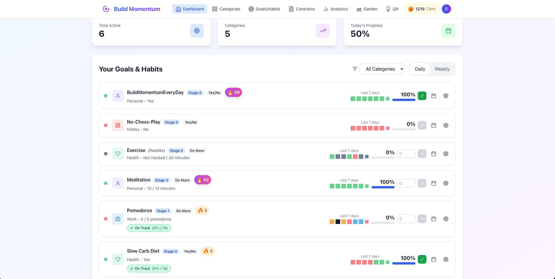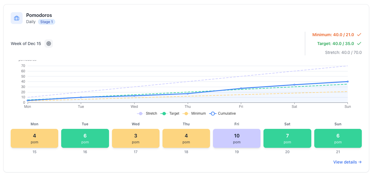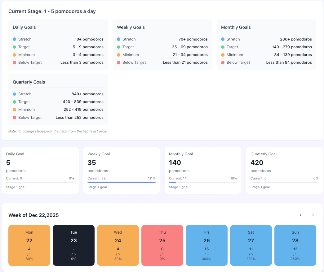 Goal & Habit Tracking Platform With Progressive Stakes—Daily to Quarterly: Beeminder's accountability without financial stress. Habitica's gamification without the busywork. Track with min/target/stretch goals (not all-or-nothing) from daily routines to 12-week objectives. Pause when life happens. Choose your stakes: gentle tracking or hard-mode with weeds. Your garden shows the truth.